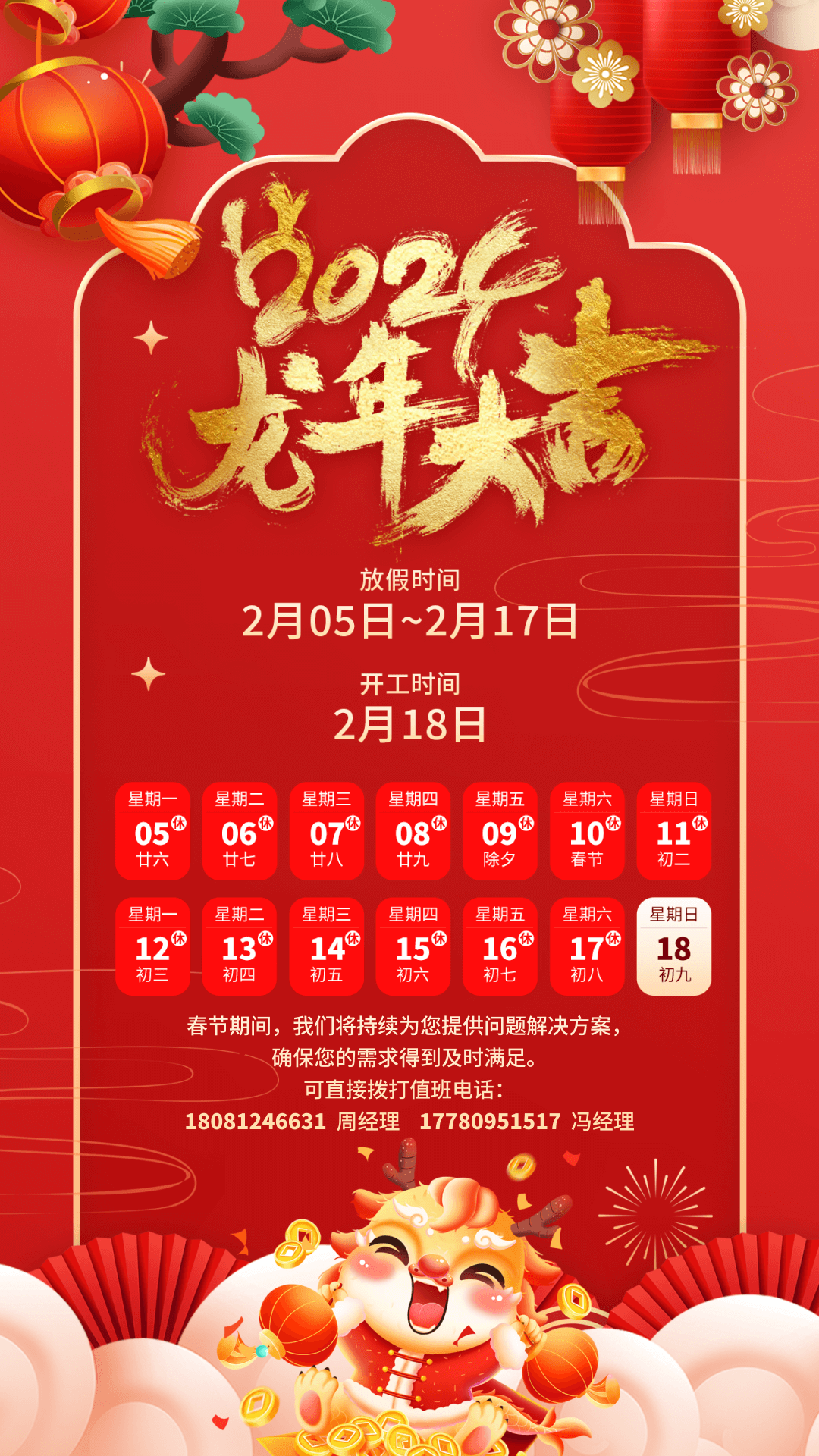 2024年新春佳節(jié)將至,根據(jù)國家的法定節(jié)假日規(guī)定及結(jié)合本公司實際情況,現(xiàn)將2024年春節(jié)放假時間作如下安排:
