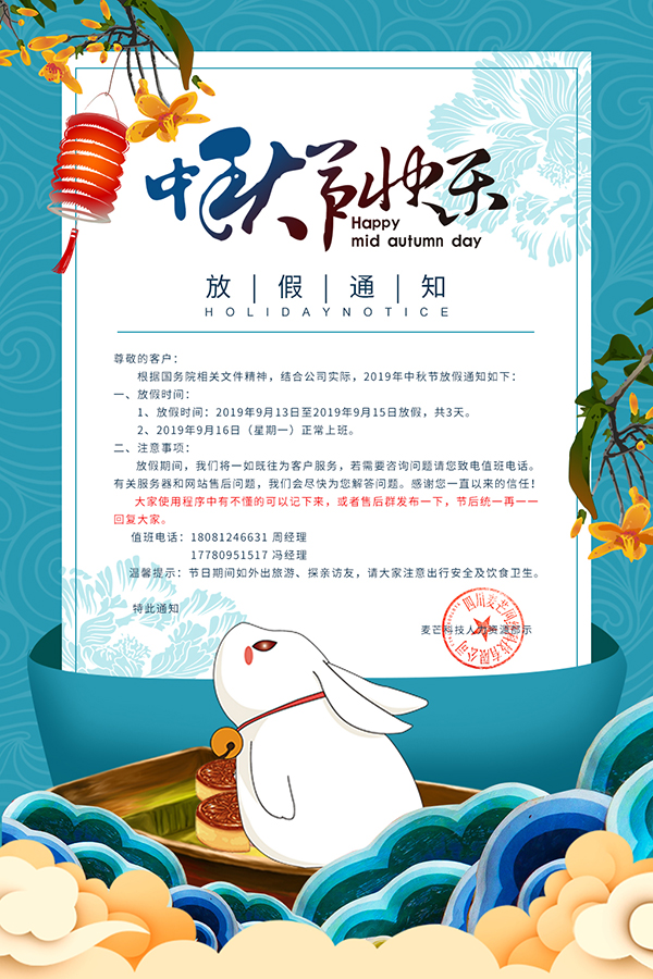 根據(jù)國務(wù)院相關(guān)文件精神,結(jié)合公司實(shí)際,2019年中秋節(jié)放假通知如下: