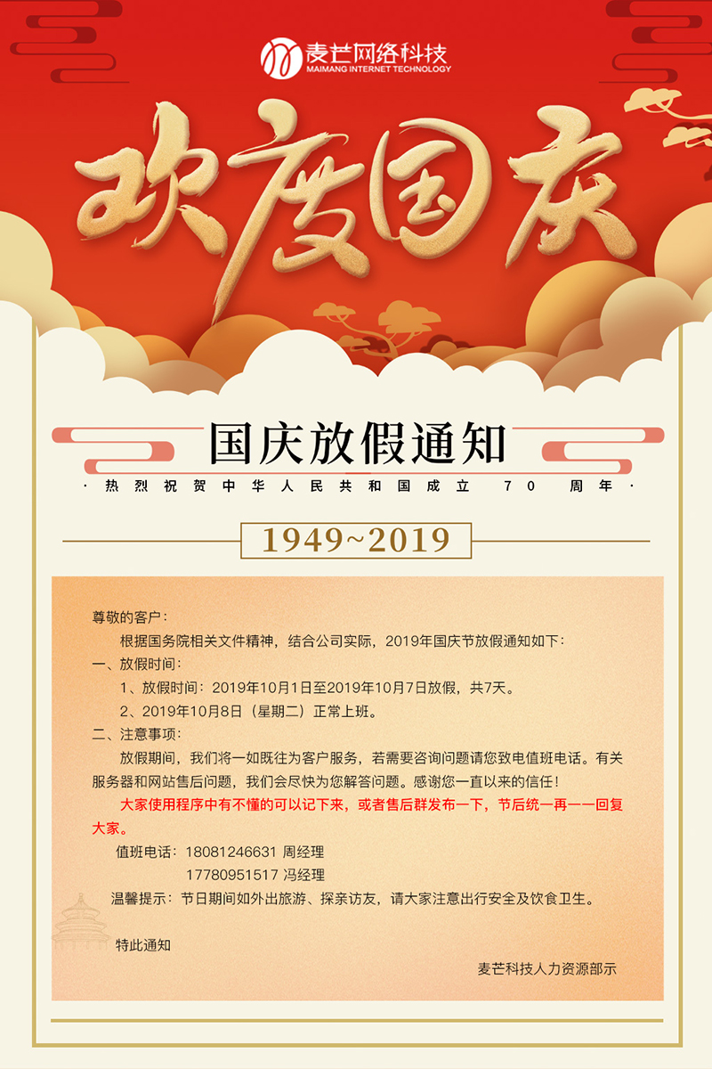 放假期間,我們將一如既往為客戶服務(wù),若需要咨詢問題請(qǐng)您致電值班電話。有關(guān)服務(wù)器和網(wǎng)站售后問題,我們會(huì)盡快為您解答問題。感謝您一直以來的信任!