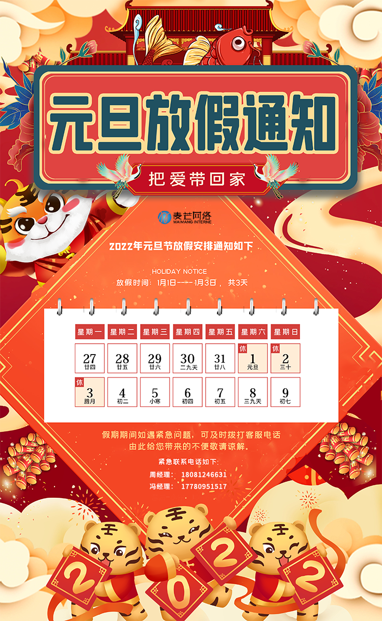 新年伊始,萬象更新。2022年元旦節(jié)即將來臨,根據(jù)國家法定假期的相關(guān)規(guī)定,并結(jié)合公司實際,現(xiàn)對2022年元旦節(jié)放假安排如下: